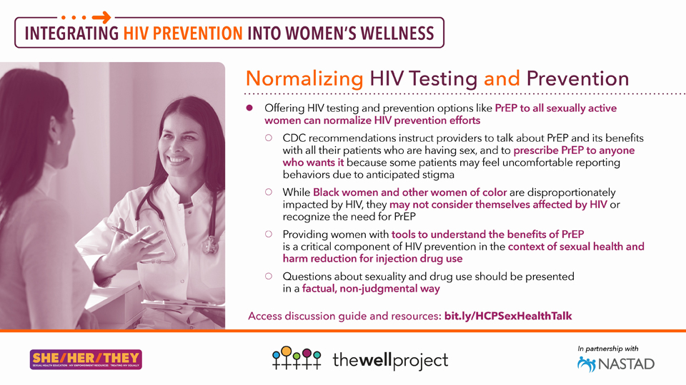 Save this image as a jpeg or share online; or download a printable pdf of "Normalizing HIV Testing and Prevention: Integrating HIV Prevention into Women’s Wellness"