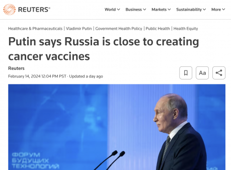 On February 14, Reuters reported that President Vladimir Putin said Russian scientists “have come very close” to creating vaccines for cancer that could soon be available to patients.